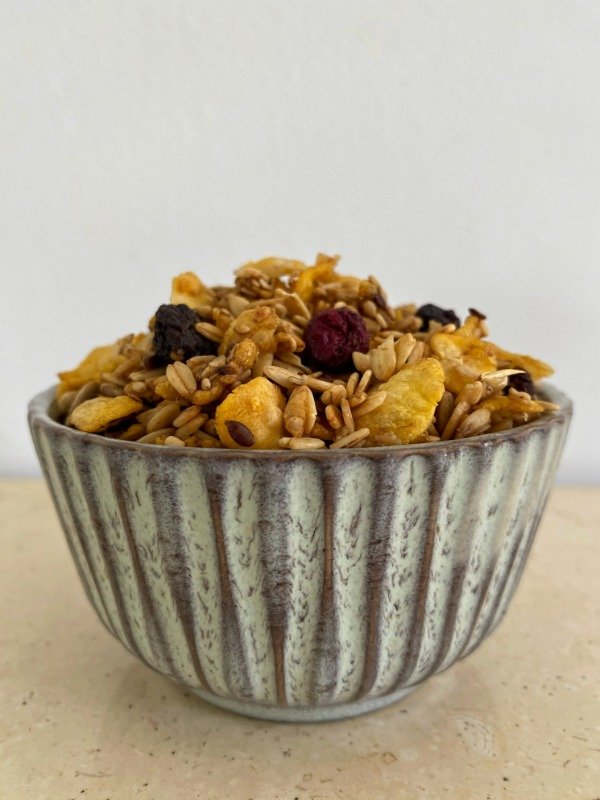 Natural, crocante y con el toque justo de dulzura. Nuestra granola de frutos rojos combina ingredientes simples y reales: pasas de uva morochas, arándanos rojos desecados, granos de avena, copos de maíz sin azúcar y una mezcla de semillas de girasol, sésamo blanco y lino. Una combinación deliciosa, rica en fibra y antioxidantes, ideal para empezar el día con energía y sabor natural. Presentación: 500 grs. Conservación: Guardar en lugar fresco y seco.